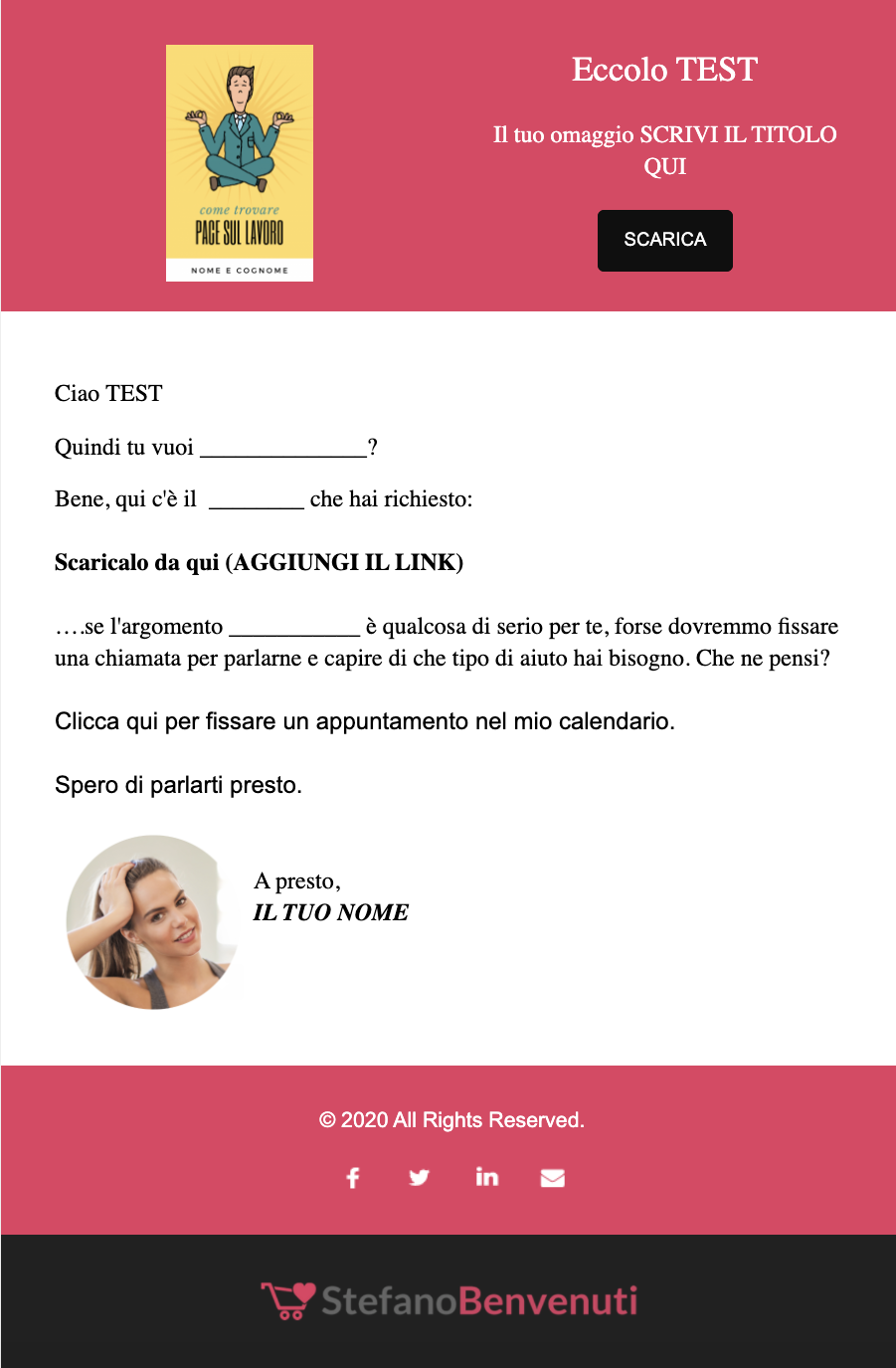 C'è anche un'e-mail impostata all'interno del modulo che invia automaticamente l’omaggio digitale, il pdf o il tuo ebook.